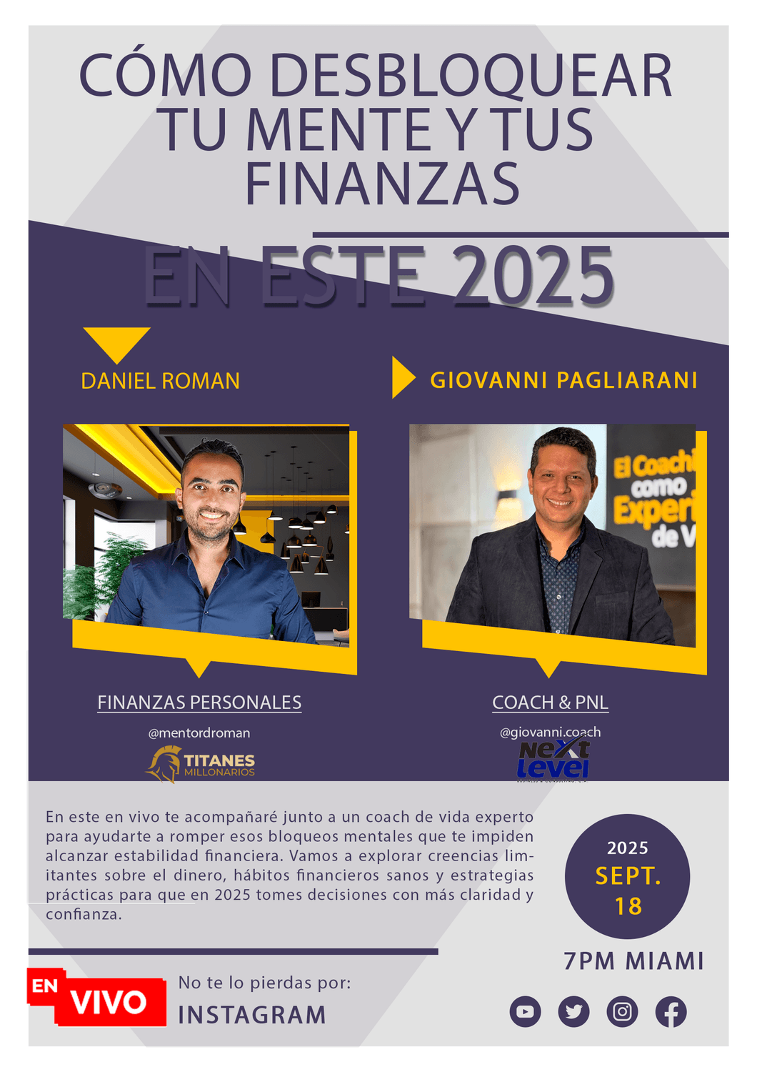 En este en vivo el 18 de Septiembre te acompañaré junto a un coach de vida experto para ayudarte a romper esos bloqueos mentales que te impiden alcanzar estabilidad financiera.